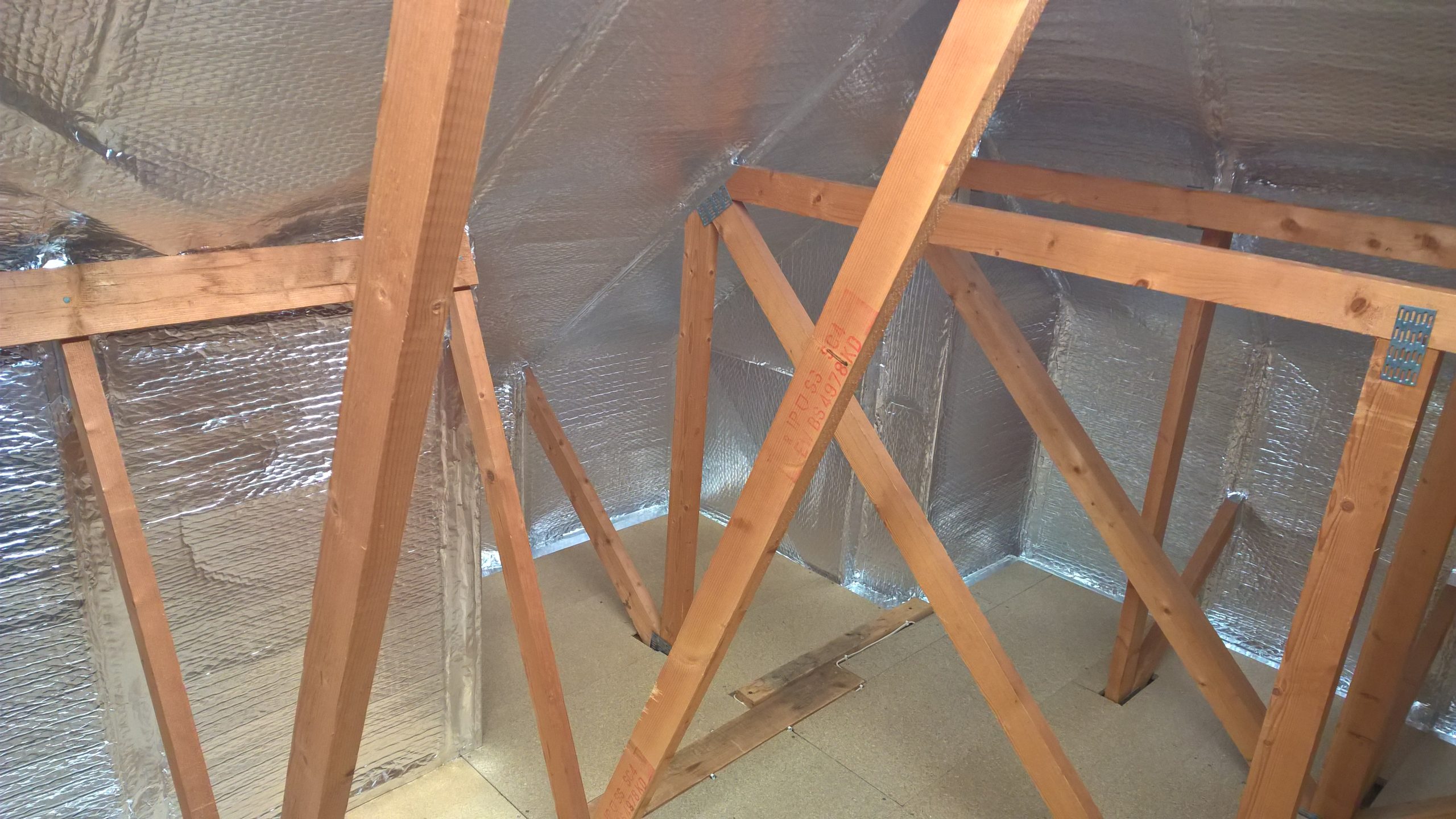 I put boards that were sold specifically as ‘loft boards’ down on the floor, screwing them directly to the joist over the top of the existing glass-fibre insulation. I also cleared this insulation away from the gaps in the soffits so air could get in for ventilation. I lined the inside of the rafters by stapling ‘ThermaWrap’ across them, leaving an air gap so the air could circulate. This is basically bubble wrap covered in silver foil that comes in big rolls. The joints between the sheets were sealed with foil tape. This helped insulate the loft and sealed it to stop the black grit from the roofing felt falling on the layout, stop the glass fibre from the insulation already up there getting in and stop (big) spiders getting in! There were many difficulties in sealing up the loft, as well as the many joists and rafters from the roof shape there was a large cold water tank, a central heating header tank and badly installed pipes to deal with. I made a frame around the tanks and covered it with Thermawrap to seal them in. I put plywood on the top but made it easily removable for maintenance (the Theremawrap is easily cut away in emergencies anyway). I had to fix the flooring under the pipes as they were already attached to it and lay the new flooring around it. I also replaced the old sliding aluminium loft ladder with a telescopic one that didn’t take up any space in the loft when folded up and changed the loft hatch to hinge down instead of lift out.